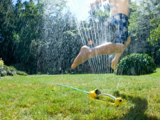 On our way back, as we walked on the sidewalk, I quickly saw the soccer field sprinklers had come on while we were in the building. A dilemma presented itself. We could avoid the sprinklers by walking in the road for a bit, but obviously this seemed unsafe… or we could walk through the water. The sun was out. It was the warmest day in some time… I put my hands up and walked through the sprinkler with glee.